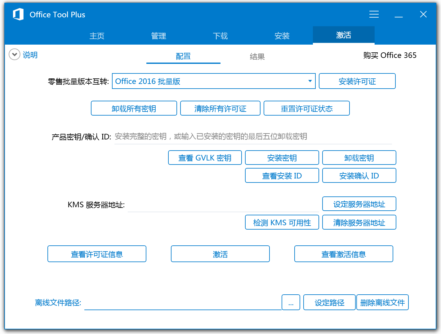 OTP 可以安装/卸载密钥、转换 Office 授权版本、配置 KMS 服务器地址、清除激活信息或者是证书、查询当前 Office 的激活信息。无论是联网激活、电话激活还是 KMS 激活, OTP 都可以轻松应付。(PS:OTP 不存在破解行为,只有配置 KMS 的功能)